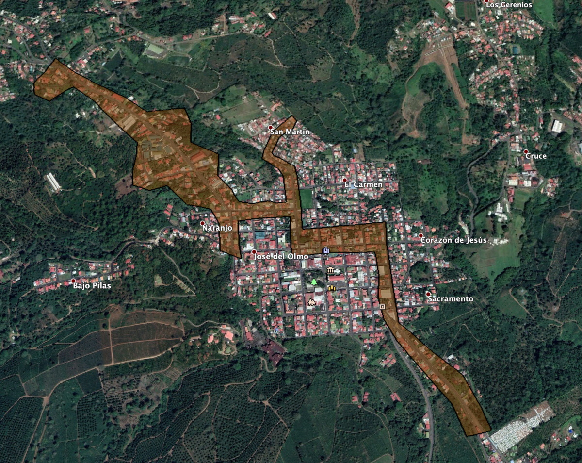 El Jardin - El Invu - Calle Pilas - Barrio El Carmen - Tres Marias - El Muro - Colegio Naranjo - El Muro - El Himalaya - Ebais - CooproNaranjo - Barrio San Martín - Urbanización Marín